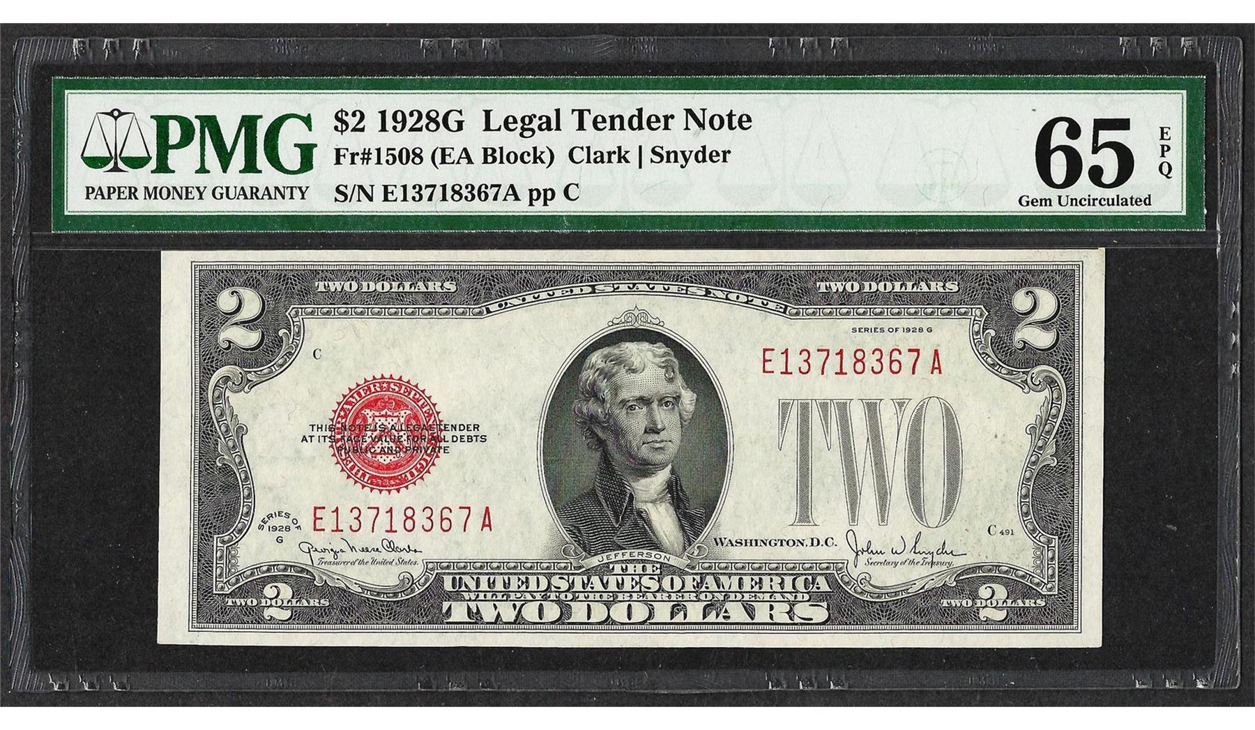 One 1928G $2 Legal Tender Note Fr.1508 PMG Gem Uncirculated 65EPQ. PMG Certified.