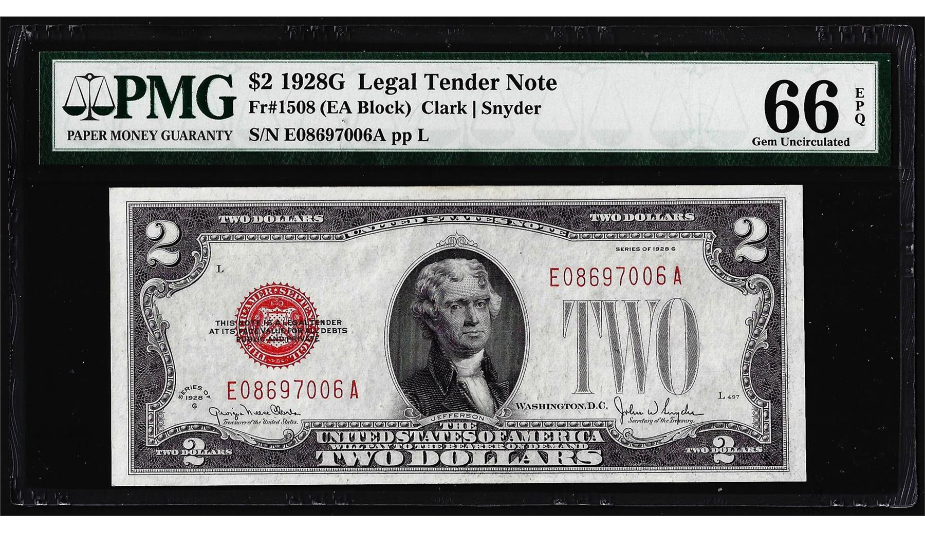 One 1928G $2 Legal Tender Note Fr.1508 PMG Gem Uncirculated 66EPQ. PMG Certified.