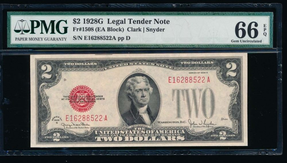 One 1928G $2 Legal Tender Note PMG 66EPQ.