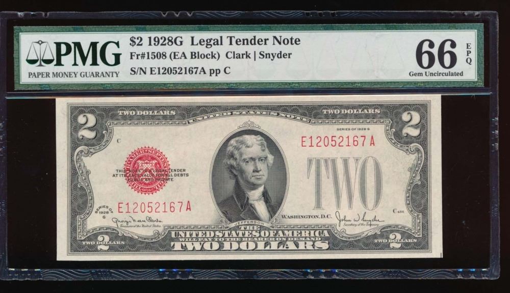 One 1928G $2 Legal Tender Note PMG 66EPQ.