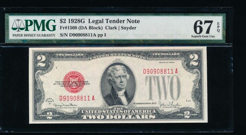 One 1928G $2 Legal Tender Note PMG 67EPQ.