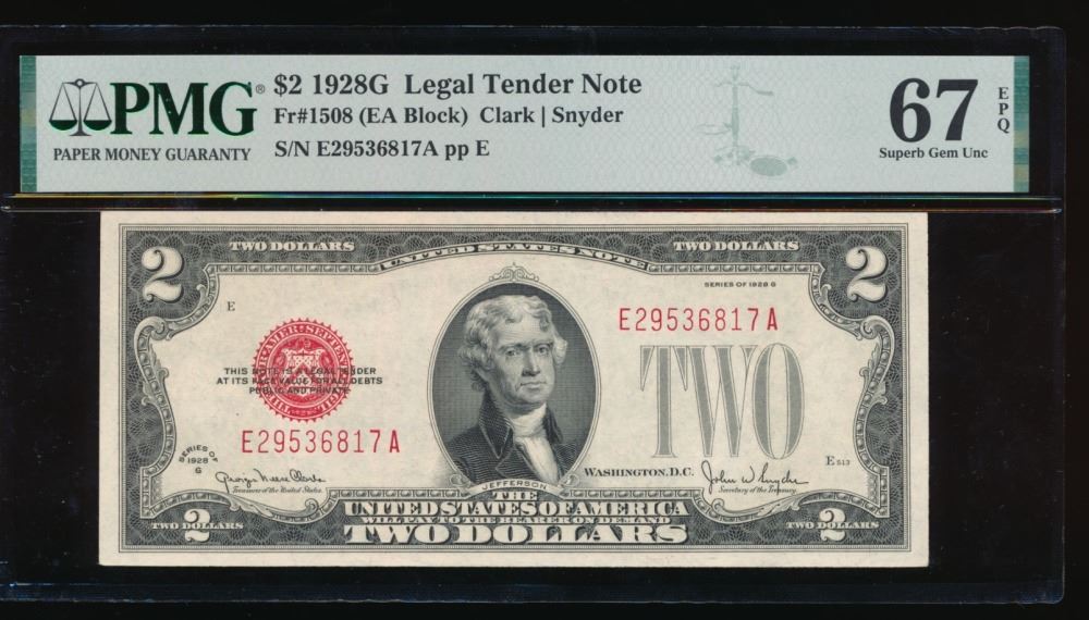 One 1928G $2 Legal Tender Note PMG 67EPQ.