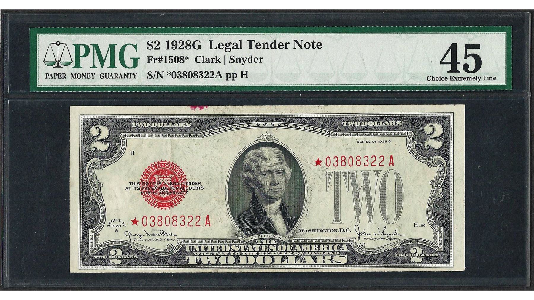 One 1928G $2 Legal Tender STAR Note Fr.1508* PMG Choice Extremely Fine 45. PMG Certified.