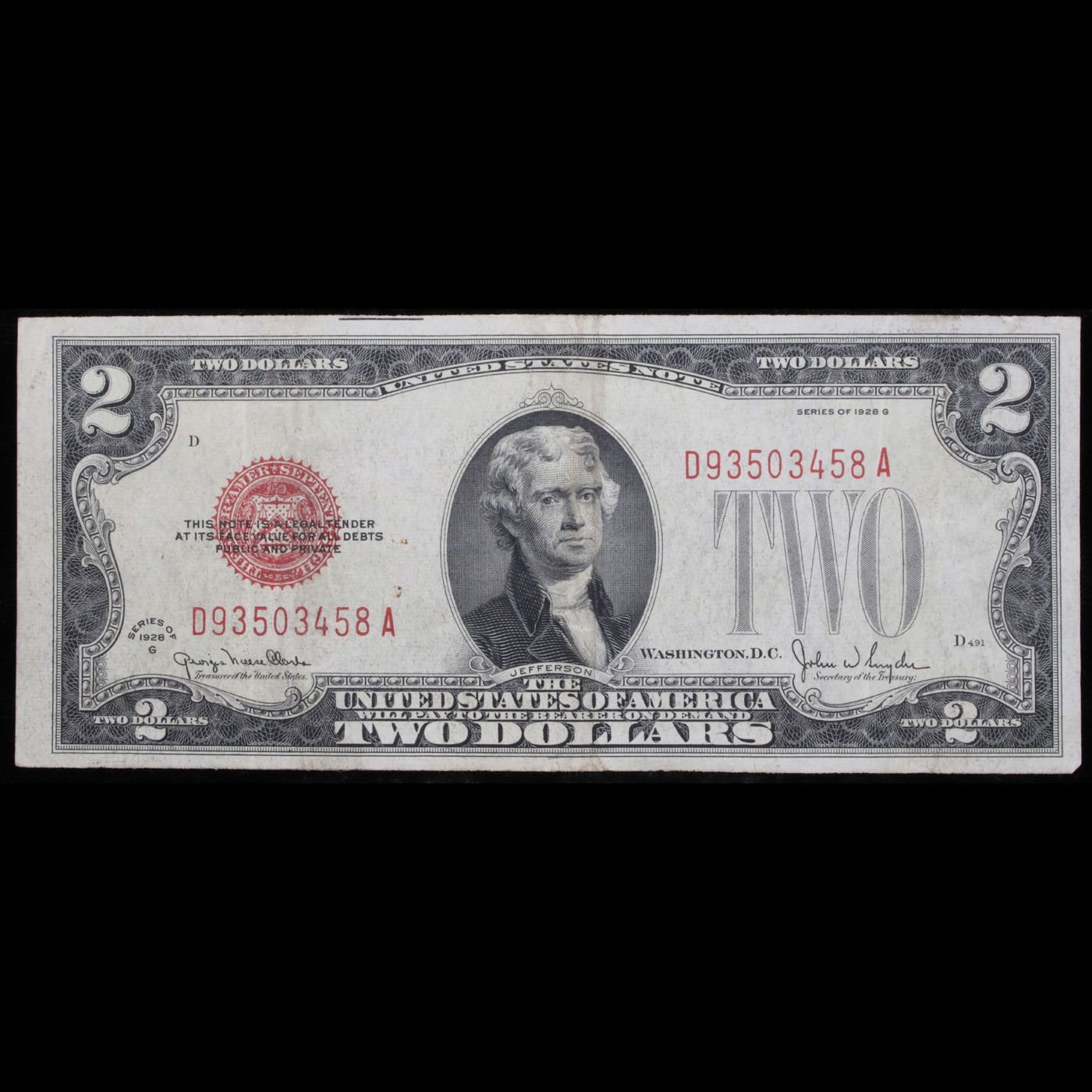 1928G $2 Red seal United States Note Grades Choice AU/BU Slider. Like all red seal two dollar legal tender notes, the series of 1928G $2 notes features Thomas Jefferson on the front and Monticello on the back. Series of 1928G $2 bills were printed between June 1949 and January 1953. These dates coincide with when Georgia Neese Clark and John W Snyder were in office together.