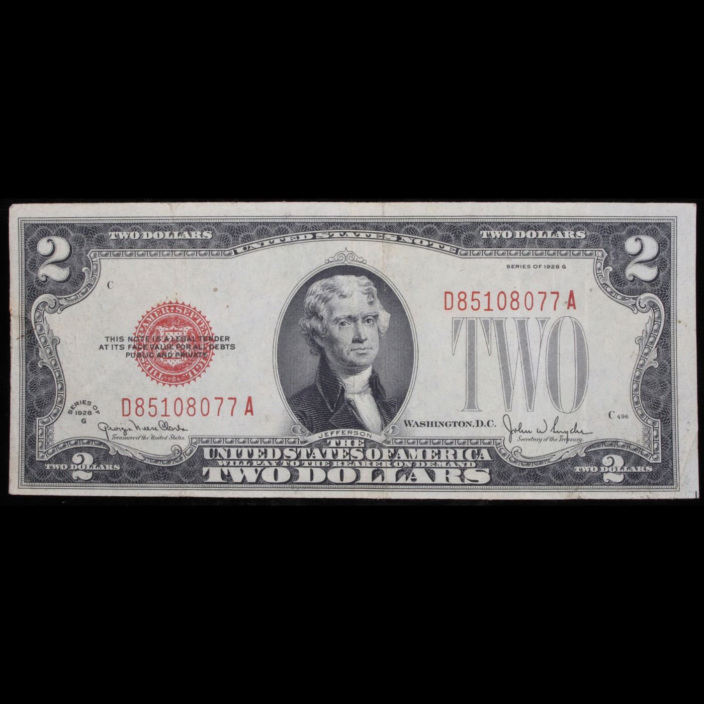 1928G $2 Red seal United States Note Grades Choice AU. Like all red seal two dollar legal tender notes, the series of 1928G $2 notes features Thomas Jefferson on the front and Monticello on the back. Series of 1928G $2 bills were printed between June 1949 and January 1953. These dates coincide with when Georgia Neese Clark and John W Snyder were in office together.