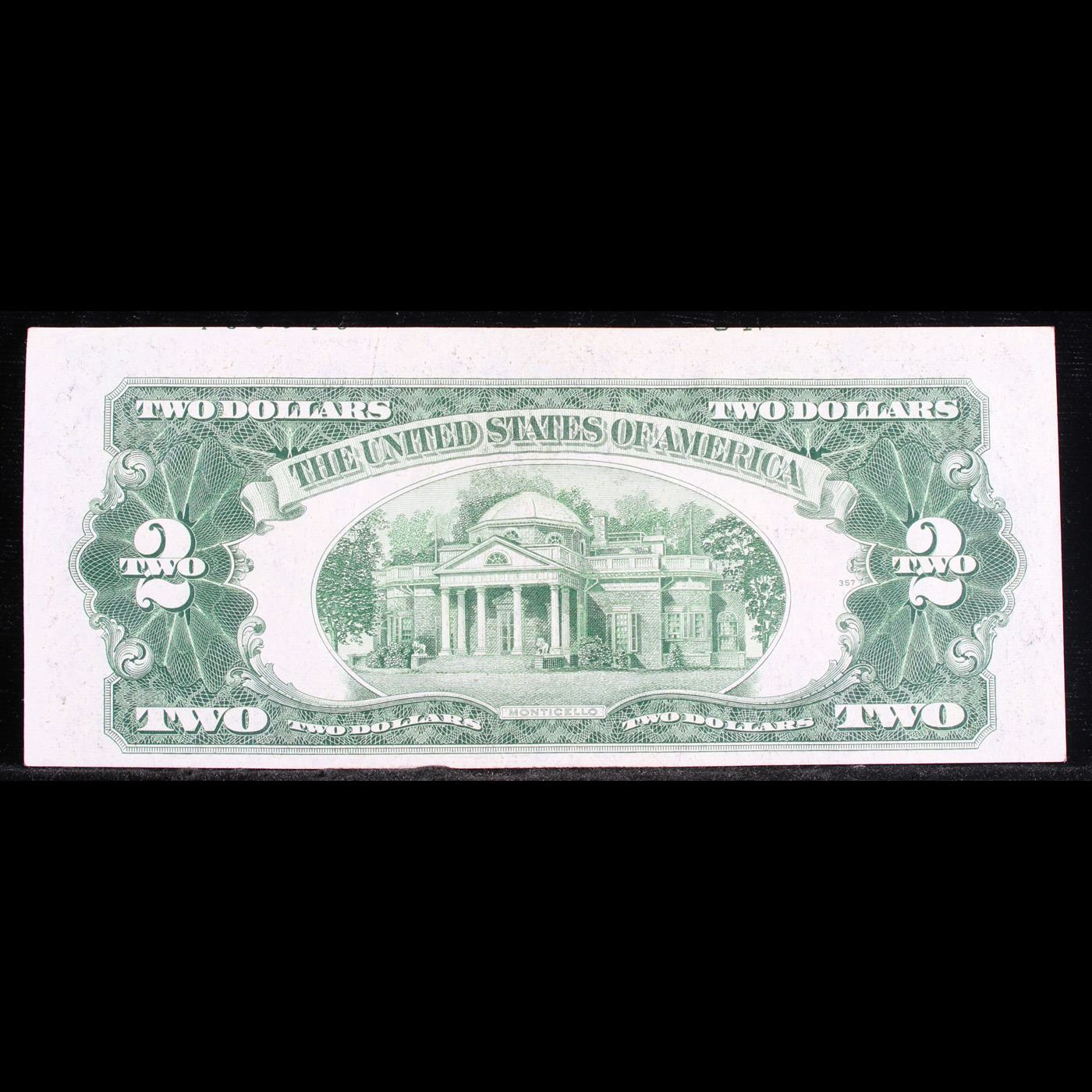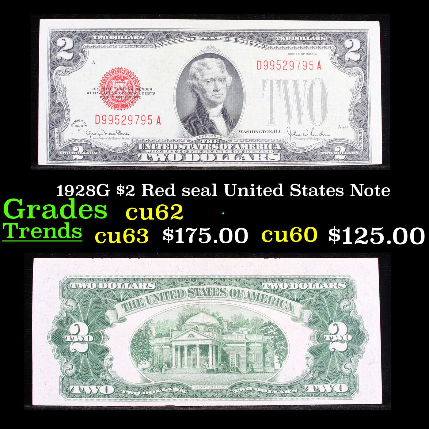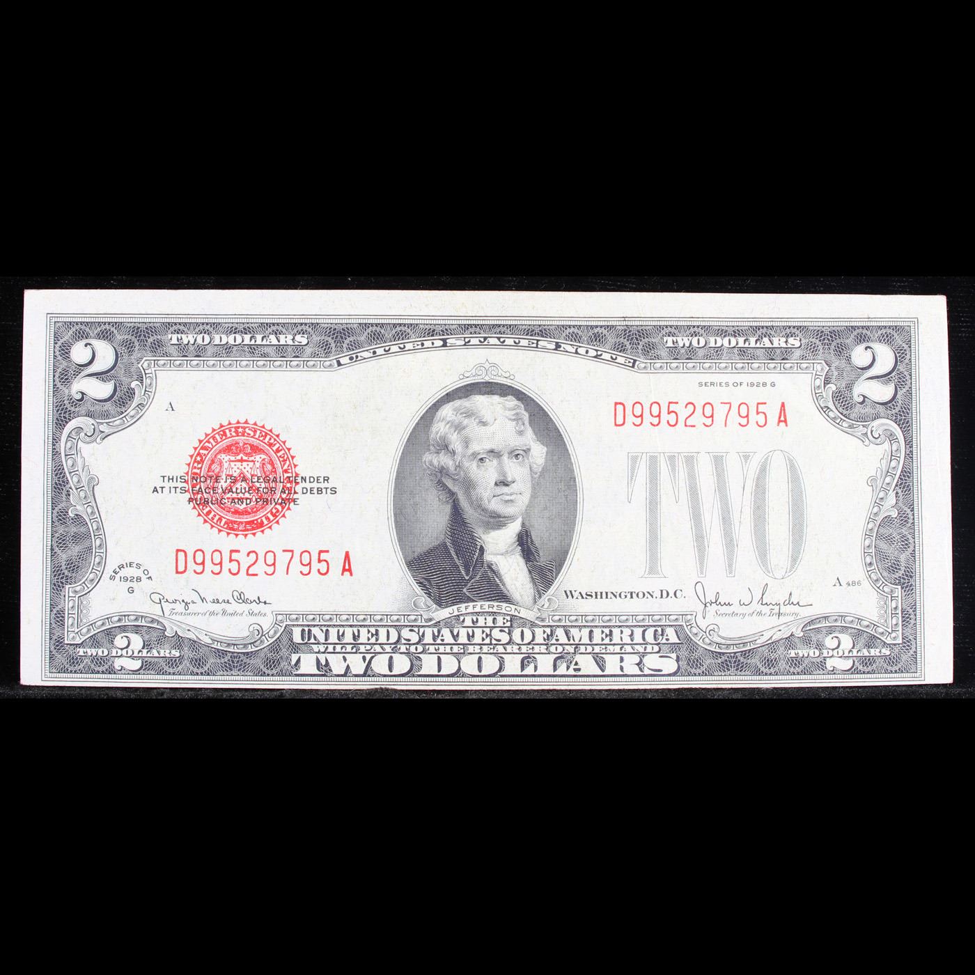 1928G $2 Red seal United States Note Grades Choice CU. Like all red seal two dollar legal tender notes, the series of 1928G $2 notes features Thomas Jefferson on the front and Monticello on the back. Series of 1928G $2 bills were printed between June 1949 and January 1953. These dates coincide with when Georgia Neese Clark and John W Snyder were in office together.
