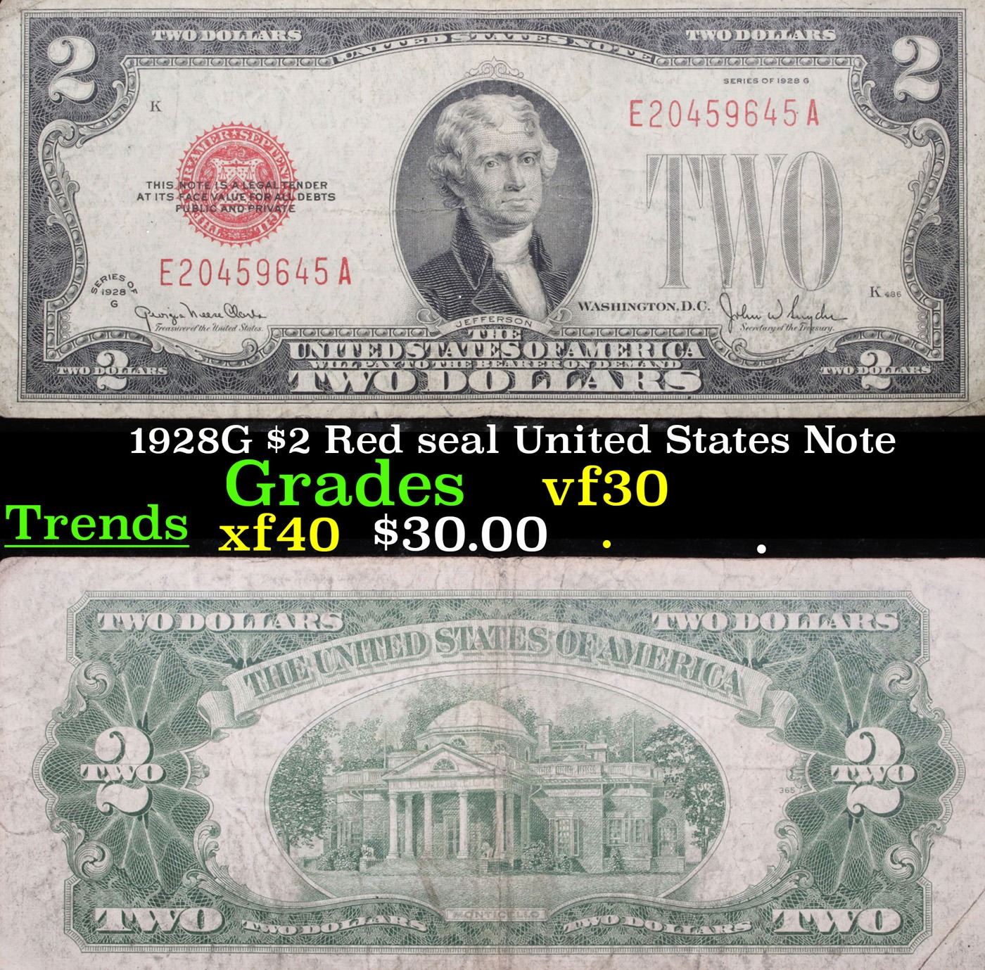 1928G $2 Red seal United States Note Grades vf++. Like all red seal two dollar legal tender notes, the series of 1928G $2 notes features Thomas Jefferson on the front and Monticello on the back. Series of 1928G $2 bills were printed between June 1949 and January 1953. These dates coincide with when Georgia Neese Clark and John W Snyder were in office together.