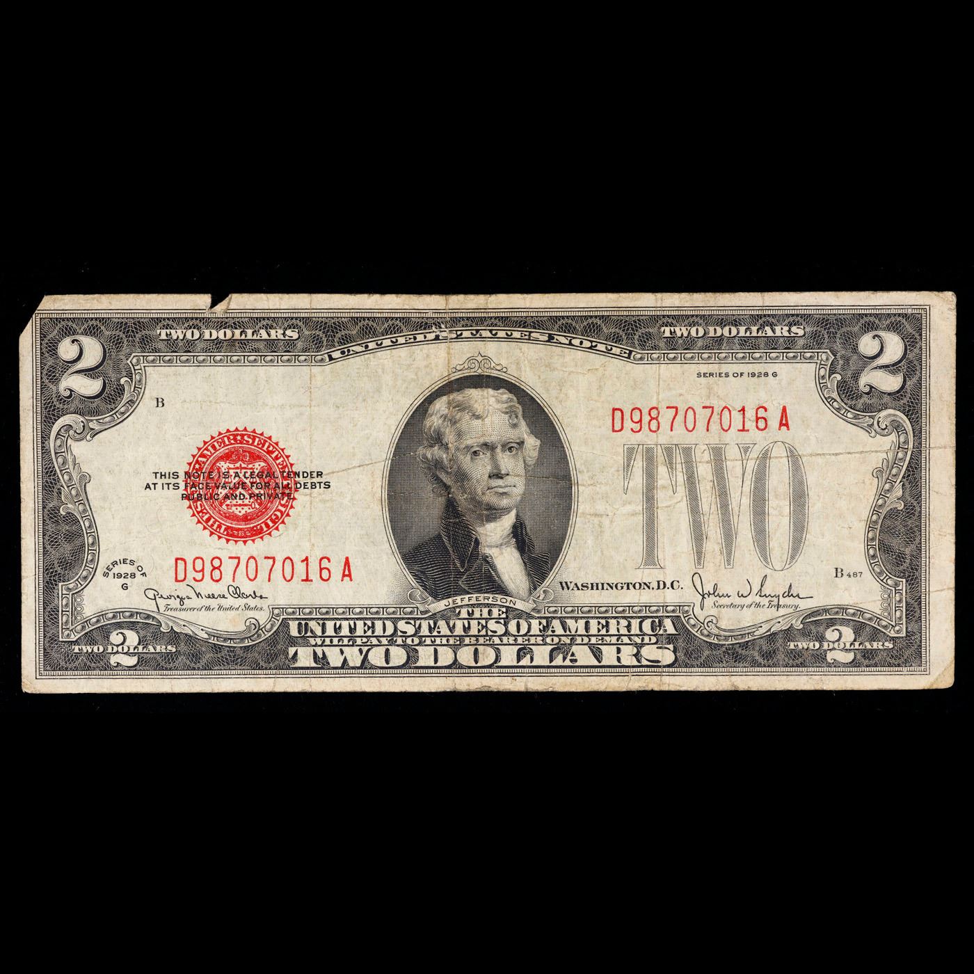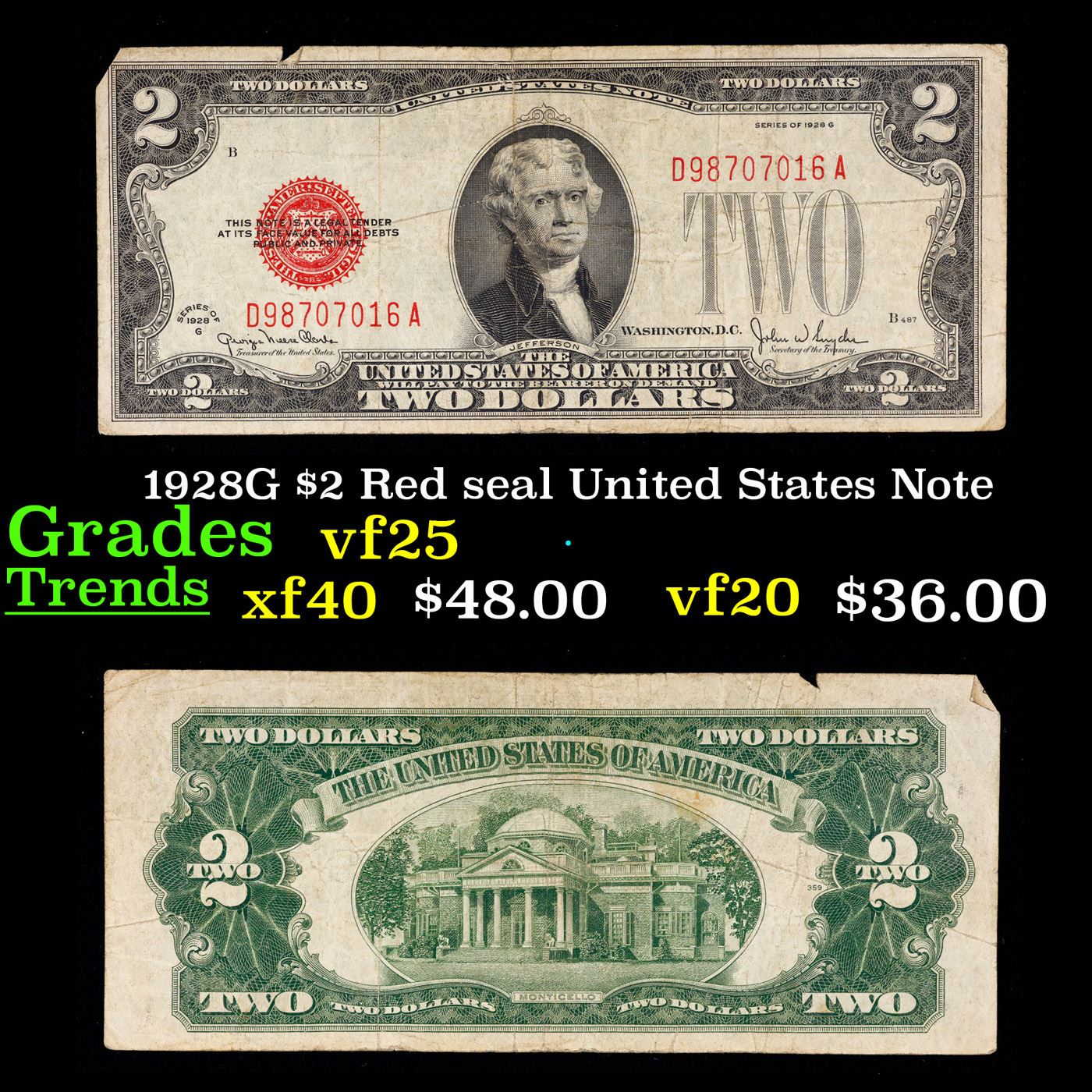 1928G $2 Red seal United States Note Grades vf+.