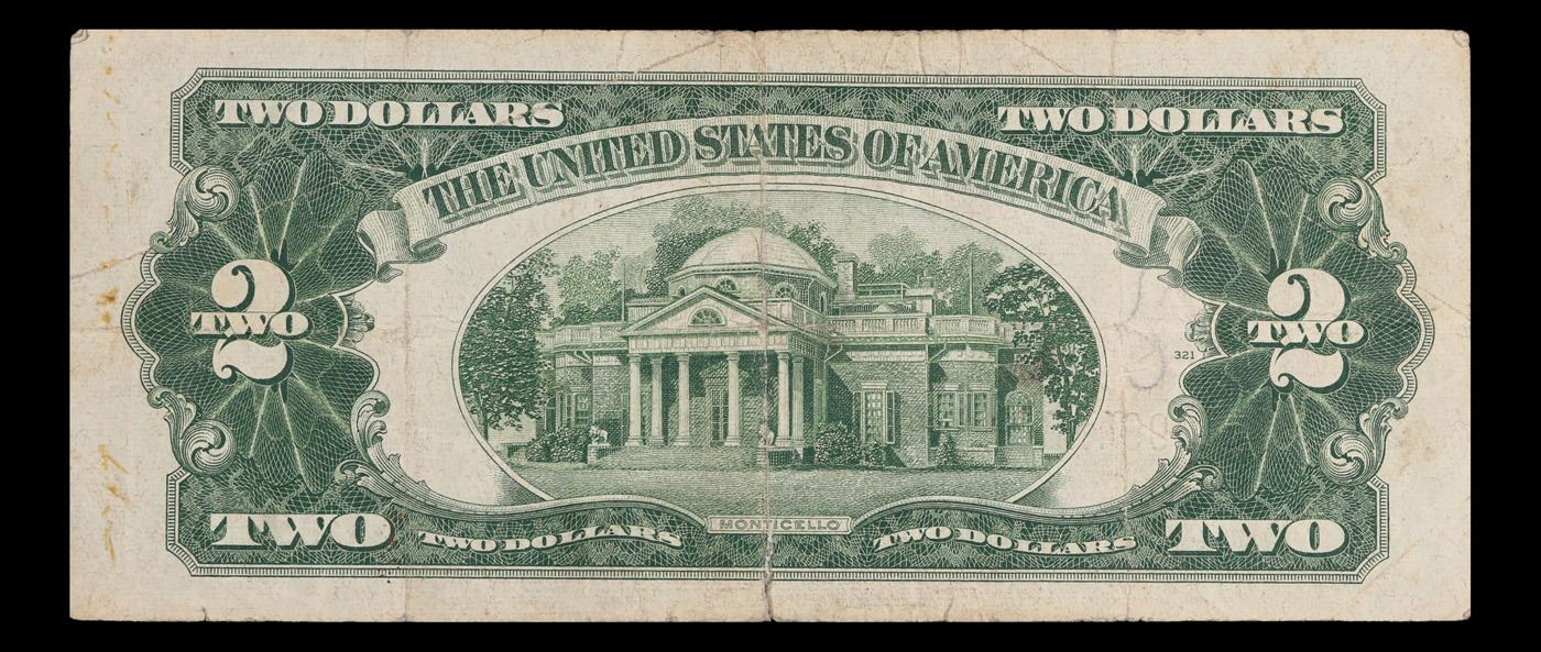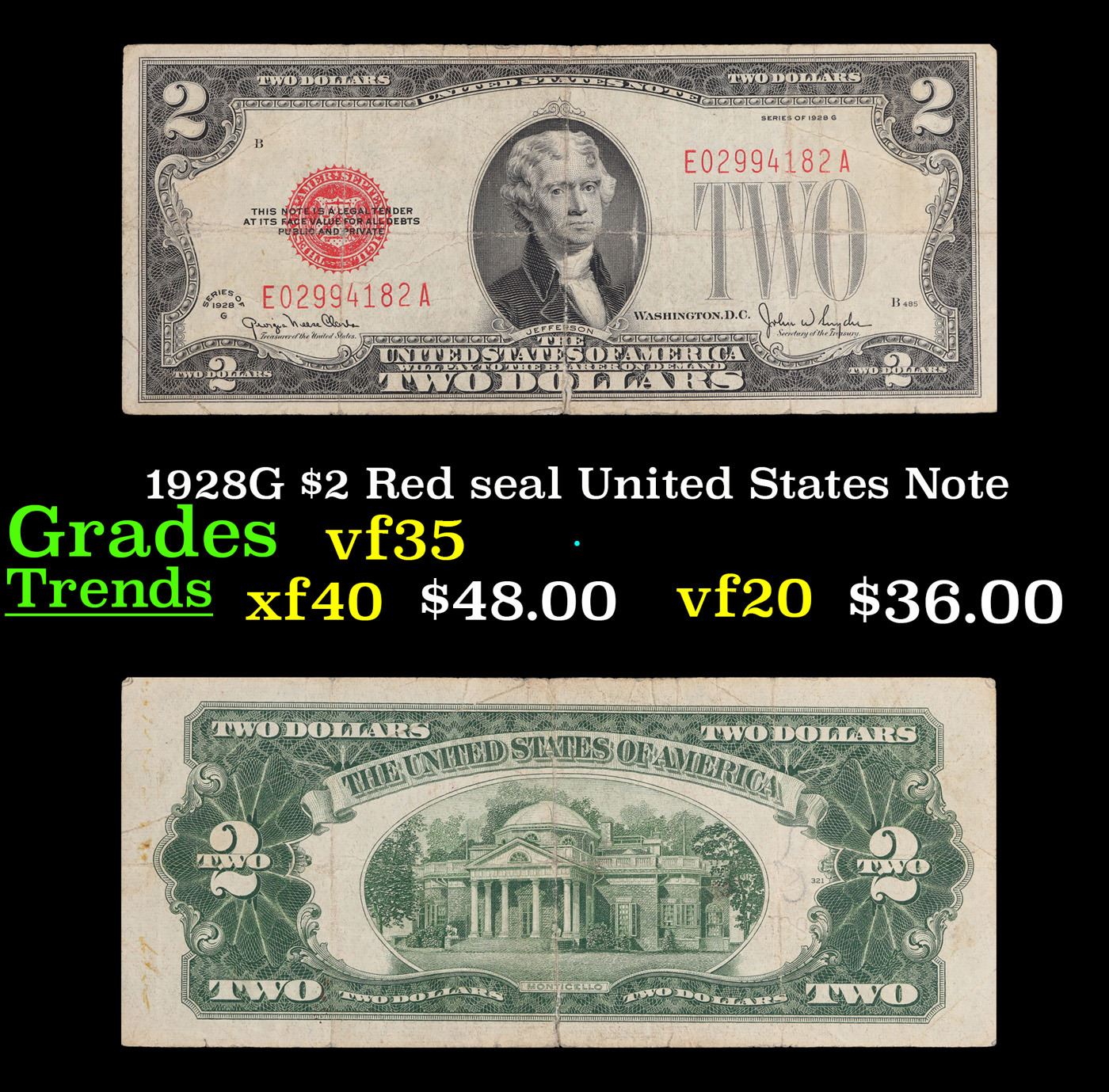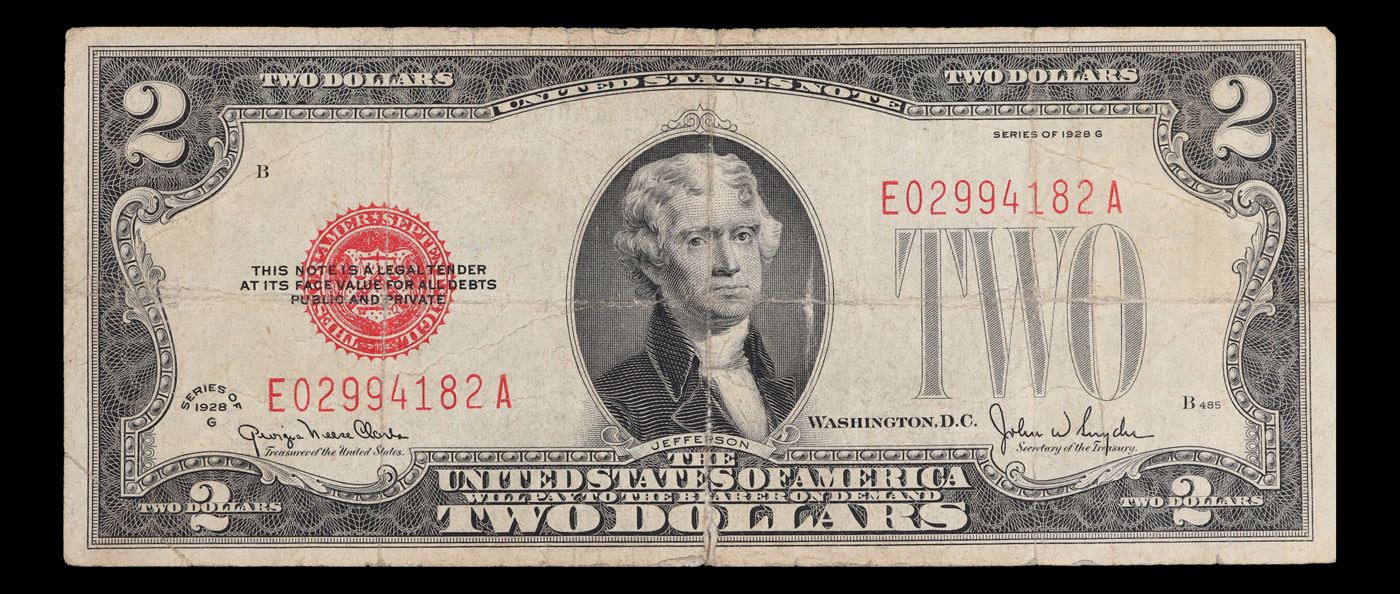 1928G $2 Red seal United States Note Grades vf++. Like all red seal two dollar legal tender notes, the series of 1928G $2 notes features Thomas Jefferson on the front and Monticello on the back. Series of 1928G $2 bills were printed between June 1949 and January 1953. These dates coincide with when Georgia Neese Clark and John W Snyder were in office together.