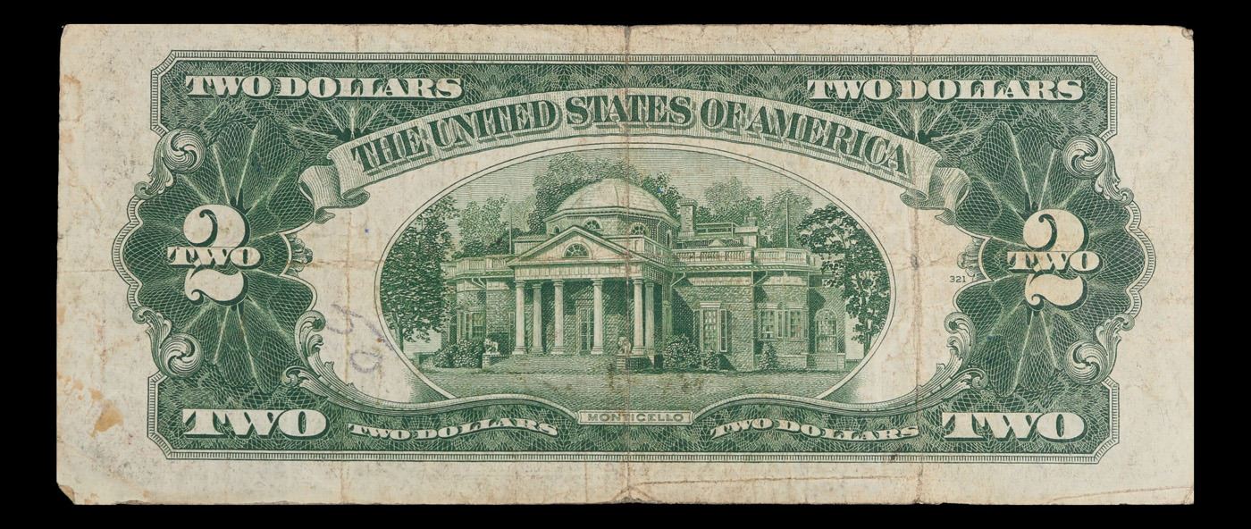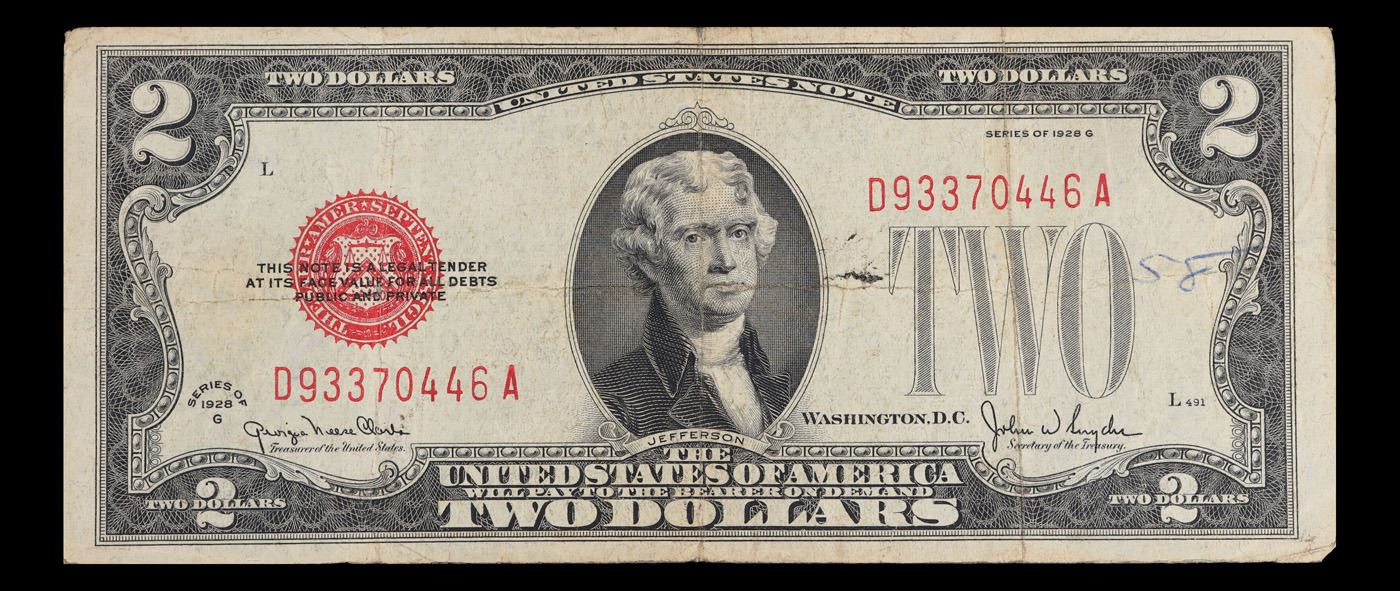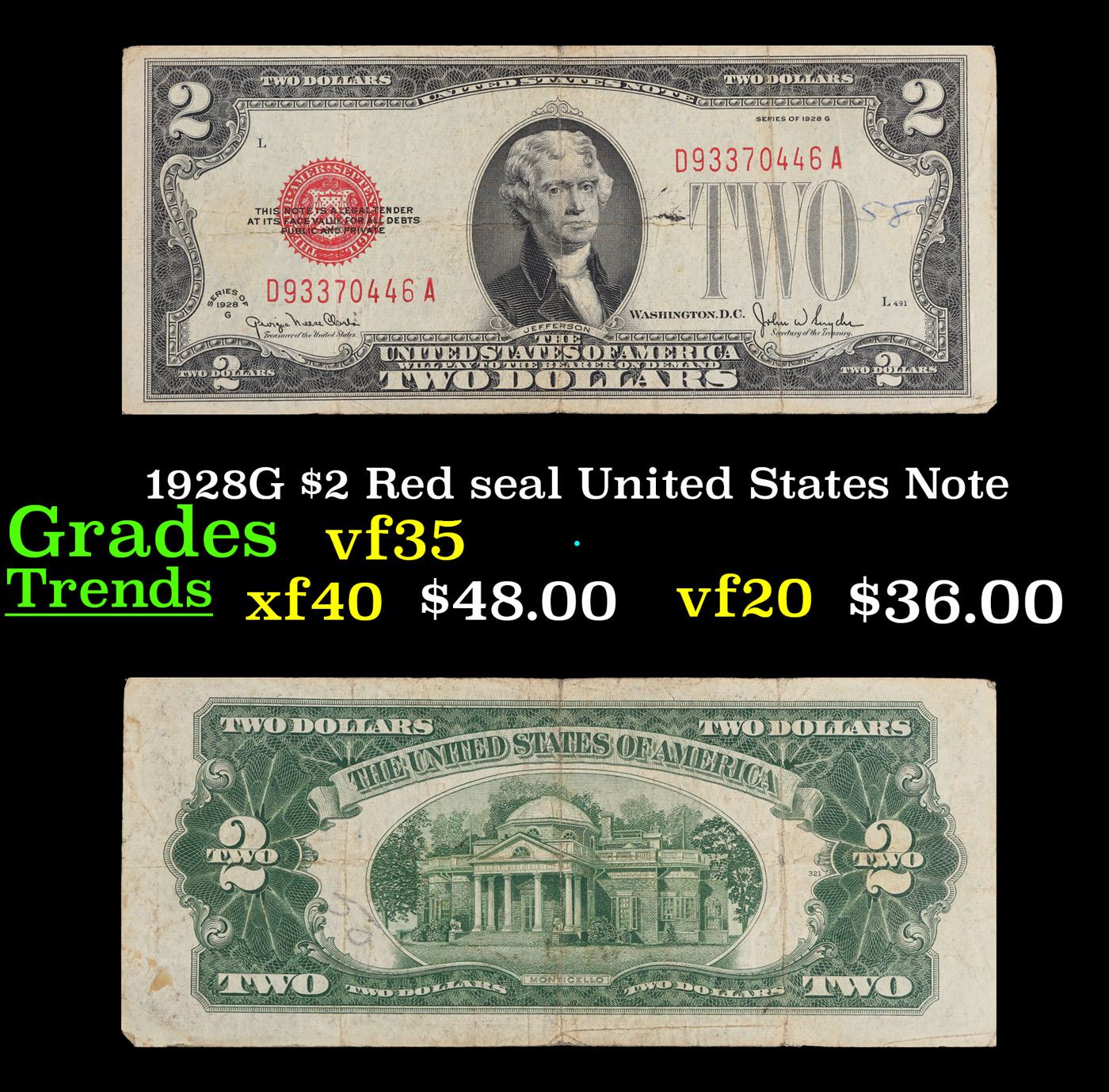 1928G $2 Red seal United States Note Grades vf++. Like all red seal two dollar legal tender notes, the series of 1928G $2 notes features Thomas Jefferson on the front and Monticello on the back. Series of 1928G $2 bills were printed between June 1949 and January 1953. These dates coincide with when Georgia Neese Clark and John W Snyder were in office together.