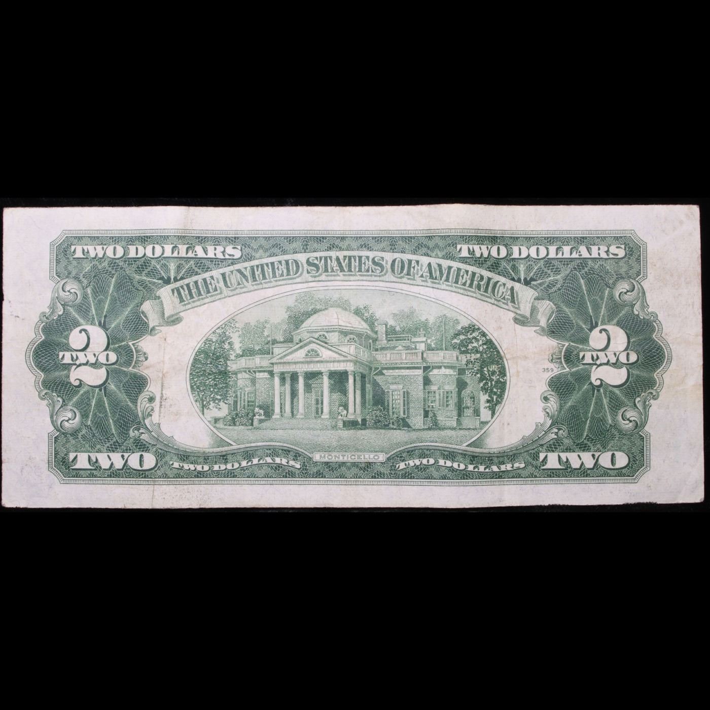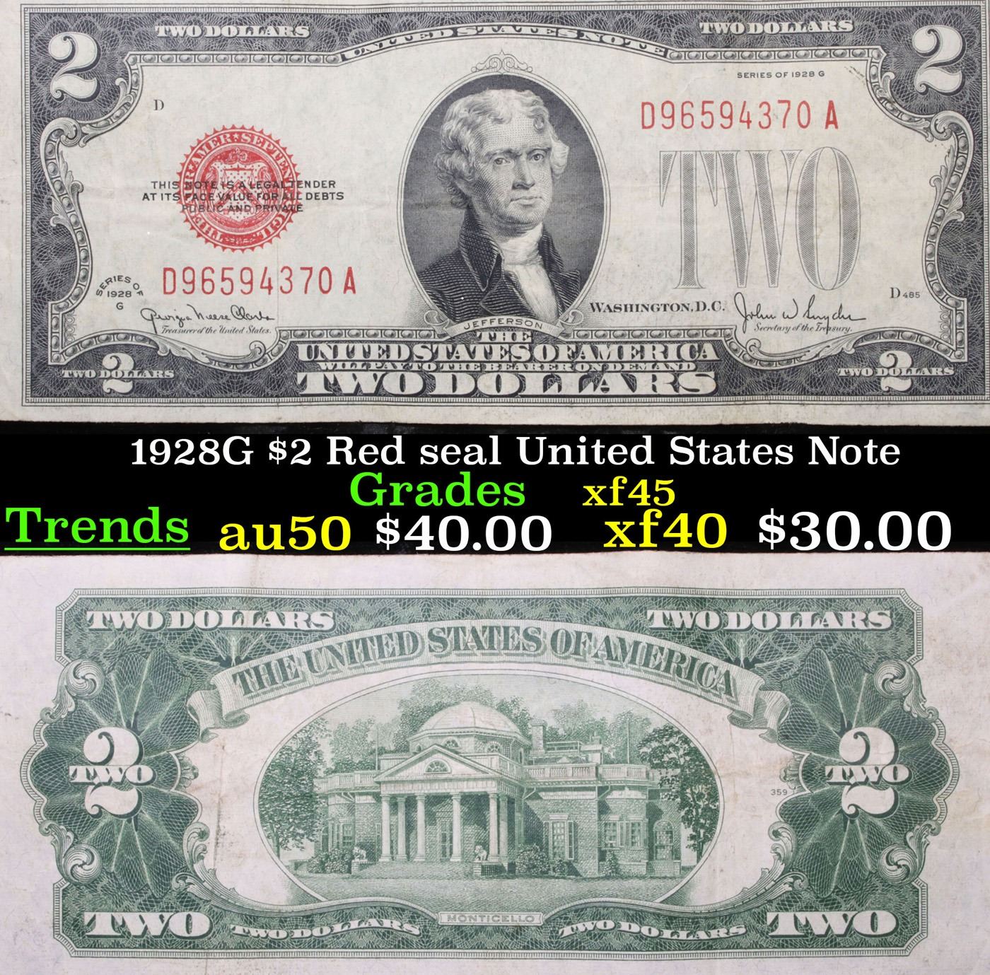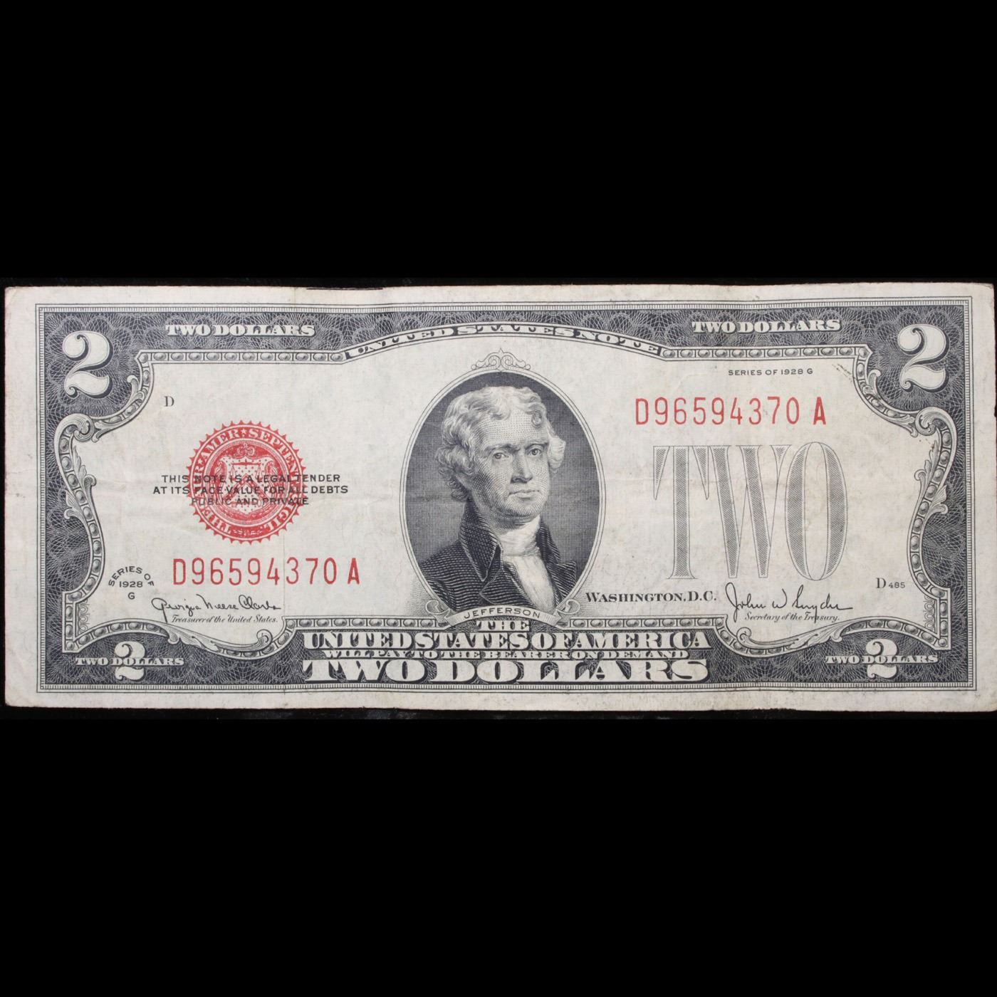 1928G $2 Red seal United States Note Grades xf+. Like all red seal two dollar legal tender notes, the series of 1928G $2 notes features Thomas Jefferson on the front and Monticello on the back. Series of 1928G $2 bills were printed between June 1949 and January 1953. These dates coincide with when Georgia Neese Clark and John W Snyder were in office together.