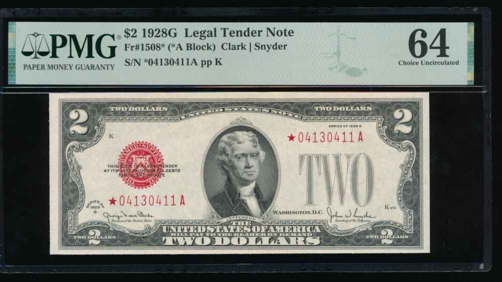 One 1928G $2 STAR Legal Tender Note PMG 64.