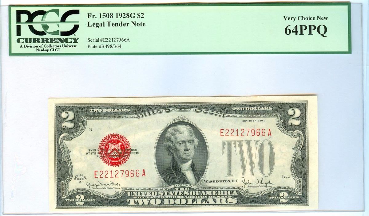 One 1928G PCGS VCN 64PPQ $2 Red Seal Legal Tender Bank Note.