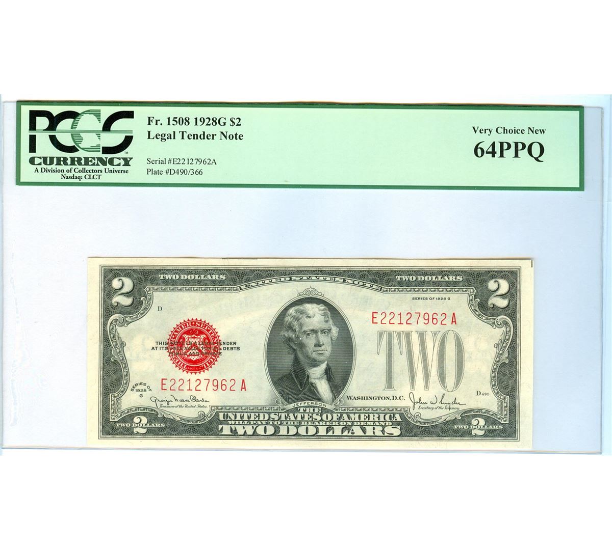 One 1928G PCGS VCN 64PPQ $2 Red Seal Legal Tender Bank Note.