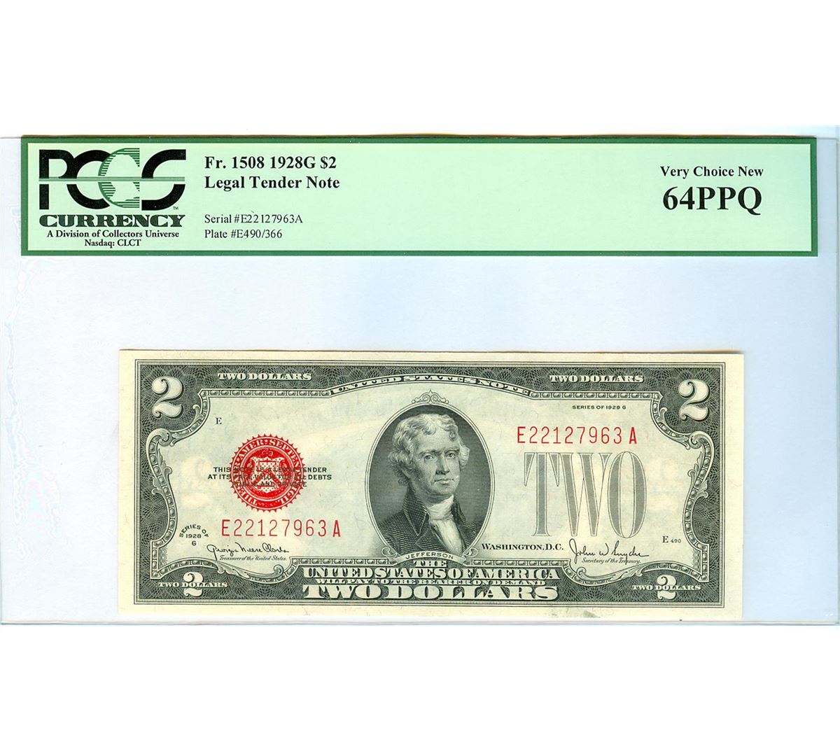 One 1928G PCGS VCN 64PPQ $2 Red Seal Legal Tender Bank Note.