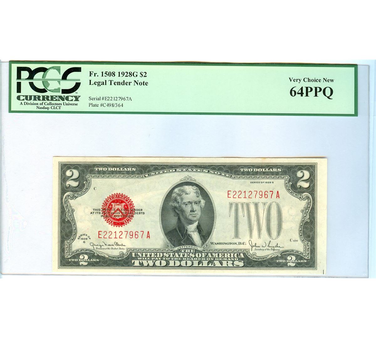 One 1928G PCGS VCN 64PPQ $2 Red Seal Legal Tender Bank Note.