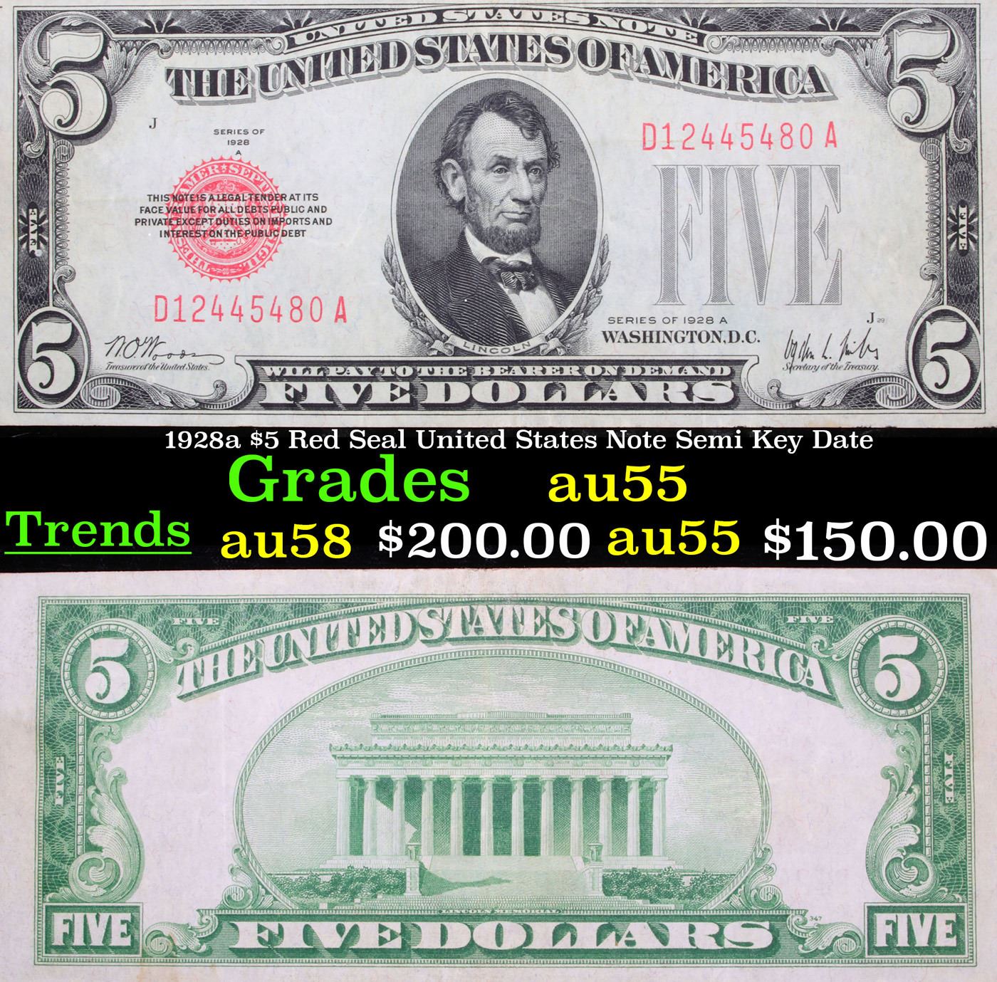 1928a $5 Red Seal United States Note Semi Key Date Grades Choice AU. Out of about 900 Million Series of 1928 $5 Red Seals Printed Only About 6% Were 1928A's