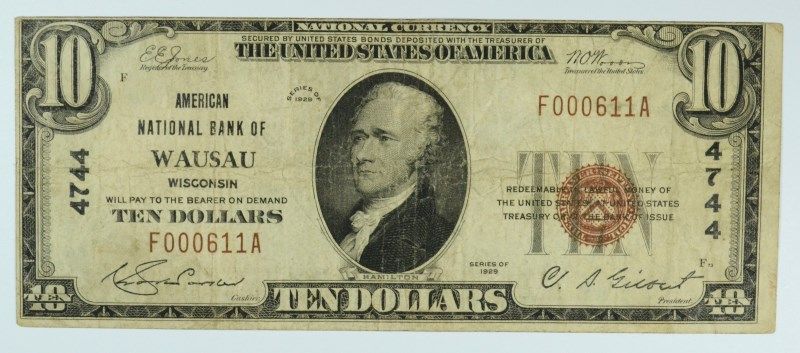 1929 $10.00 ANB WAUSAU, WISCONSIN CH 4744 VG