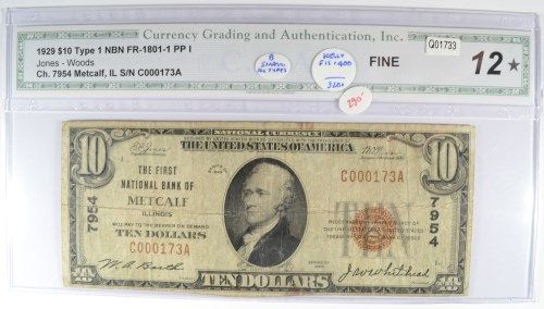 1929 $10.00 NATIONAL BANK NOTE, METCALF, IL #7954 CGA-12