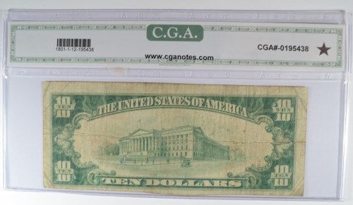 1929 $10.00 NATIONAL BANK NOTE, METCALF, IL #7954 CGA-12