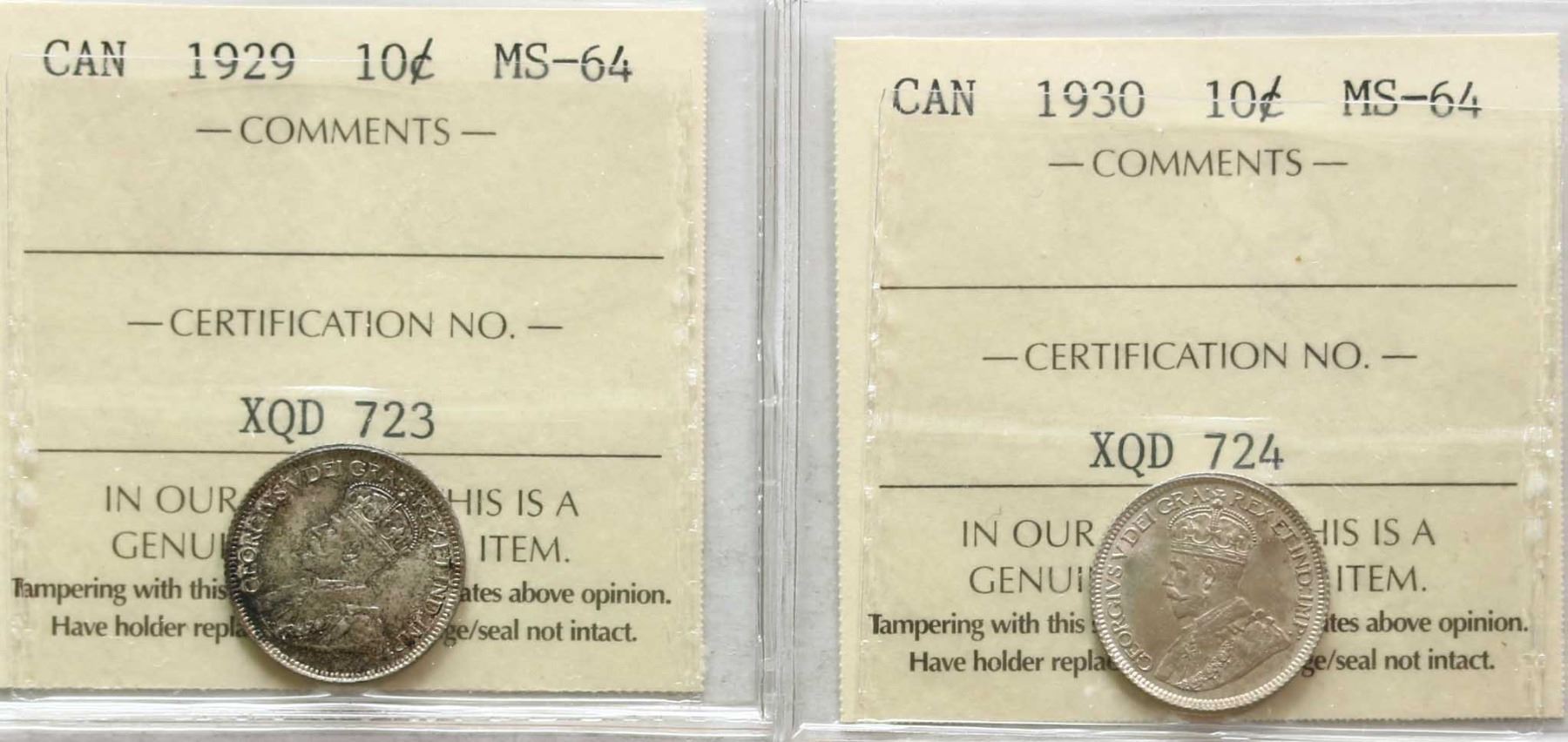 1929 10¢, 1930 Both coins ICCS Very Choice Mint State-64.