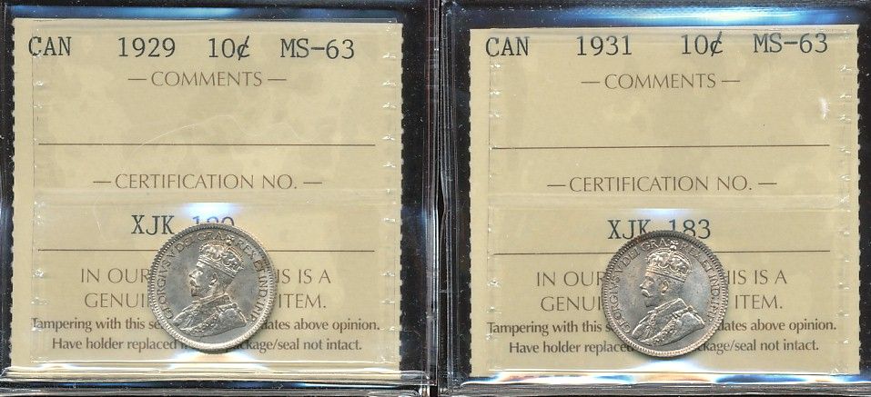 1929 10¢ & 1931 ICCS MS63. Lot of 2 coins.