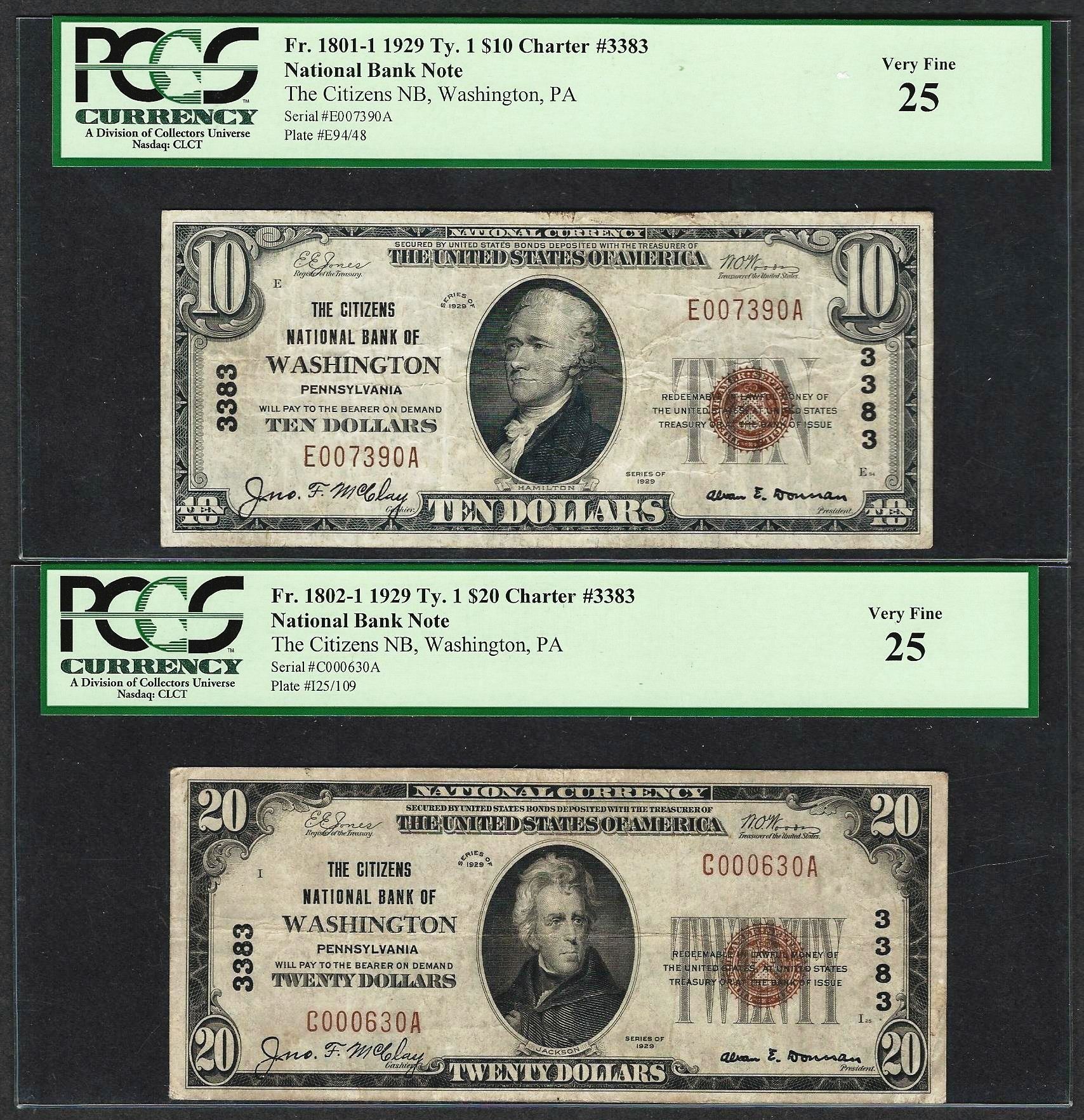 One 1929 $10/20 Citizens NB Washington, PA CH# 3383 National Currency Notes PCGS VF25.