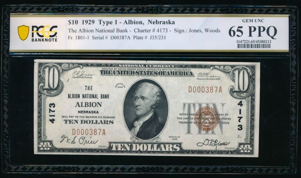One 1929 $10 Albion NE National PCGS 65PPQ.