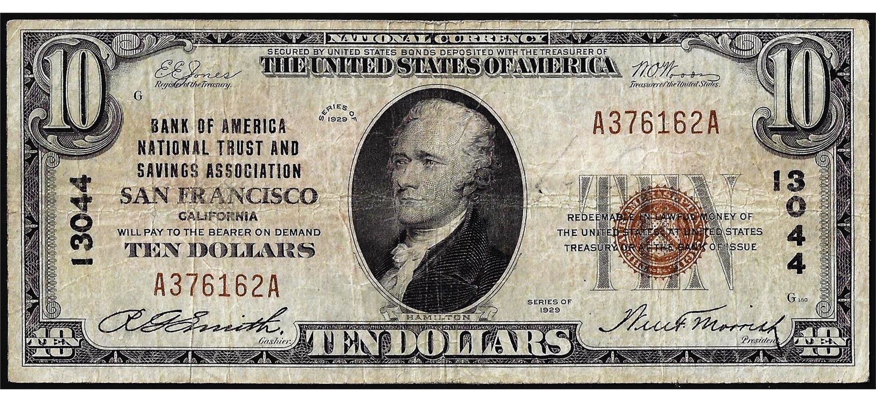 One 1929 $10 Bank of America San Francisco, CA CH# 13044 National Currency Note.
