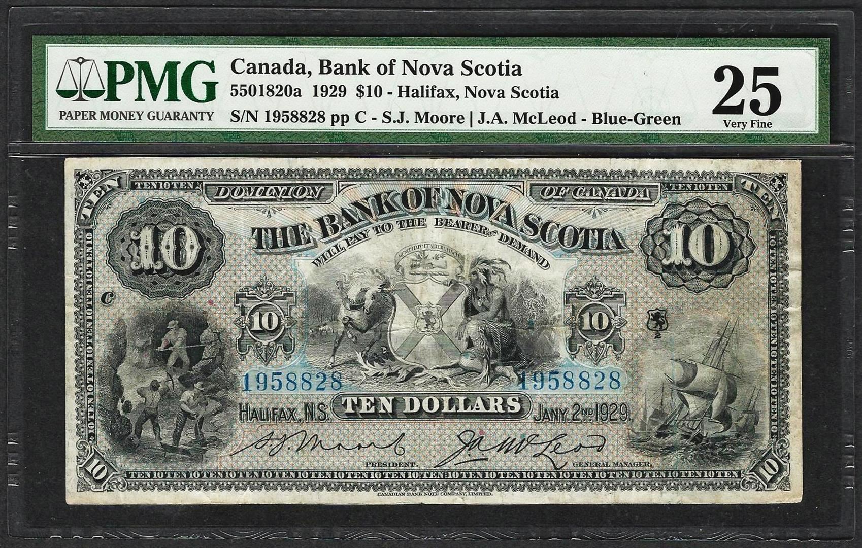 One 1929 $10 Bank of Nova Scotia Canada Bank Note PMG Very Fine 25. PMG Certified.