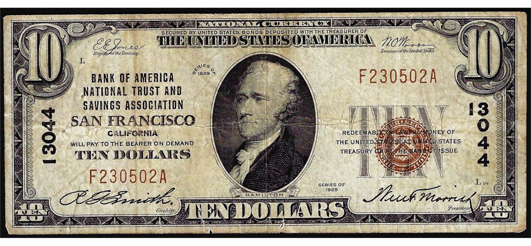 One 1929 $10 BofA San Francisco, CA CH# 13044 National Currency Note.