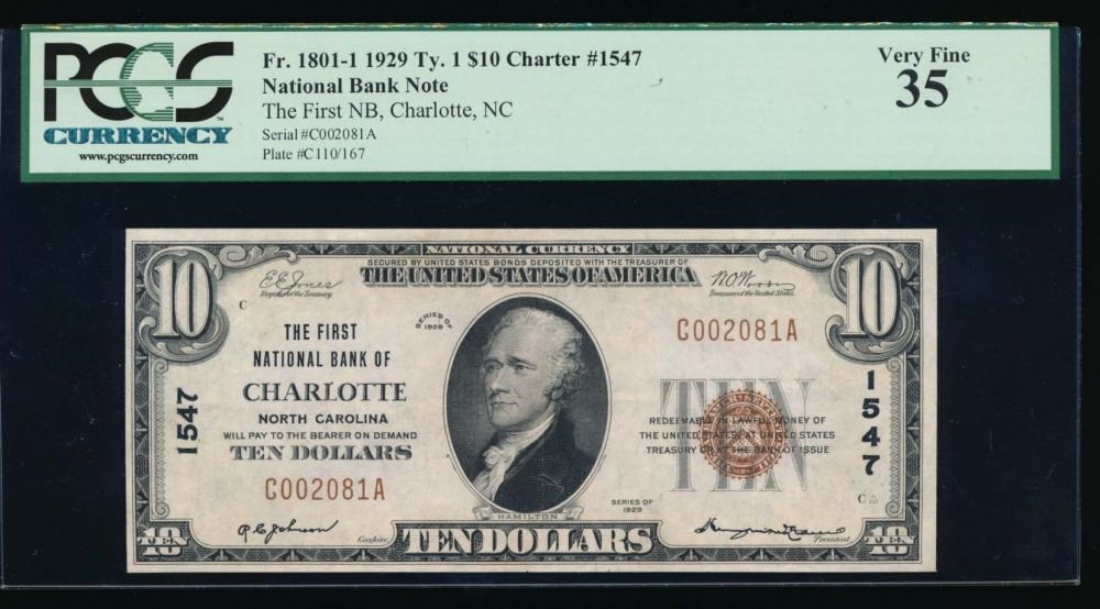 One 1929 $10 Charlotte National Bank Note PCGS 35.