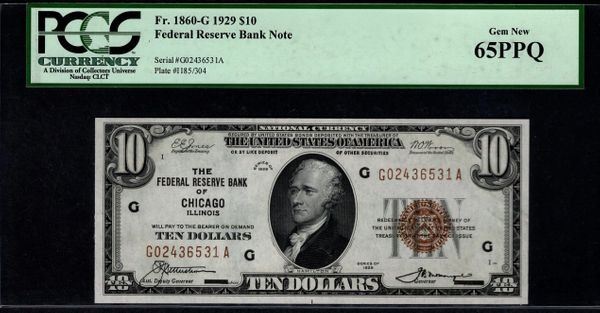 One 1929 $10 Chicago Federal Reserve Bank Note PGCS 65PPQ.