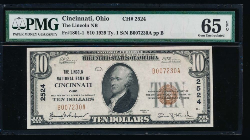 One 1929 $10 Cincinnati National Bank Note PMG 65EPQ.