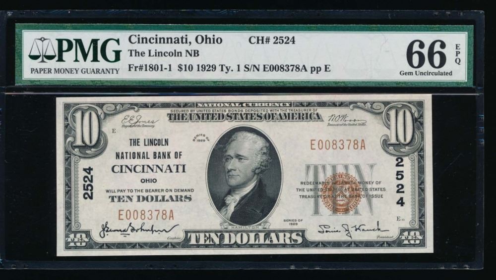 One 1929 $10 Cincinnati National Bank Note PMG 66EPQ.