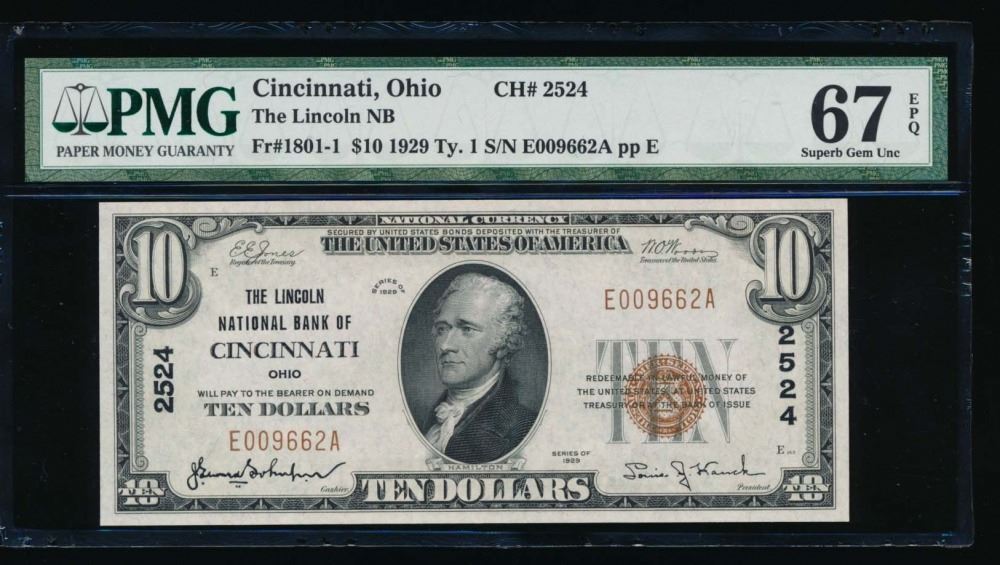 One 1929 $10 Cincinnati National Bank Note PMG 67EPQ.