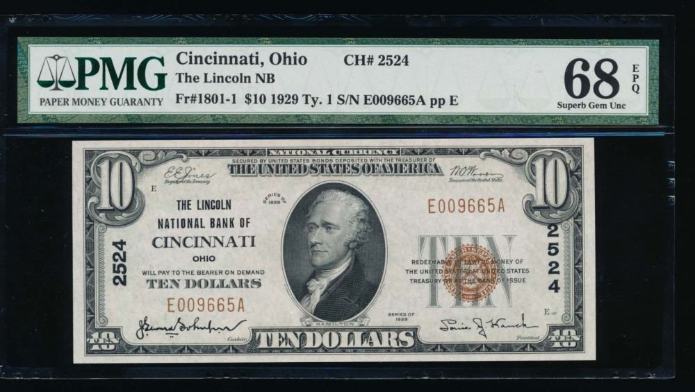 One 1929 $10 Cincinnati National Bank Note PMG 68EPQ.
