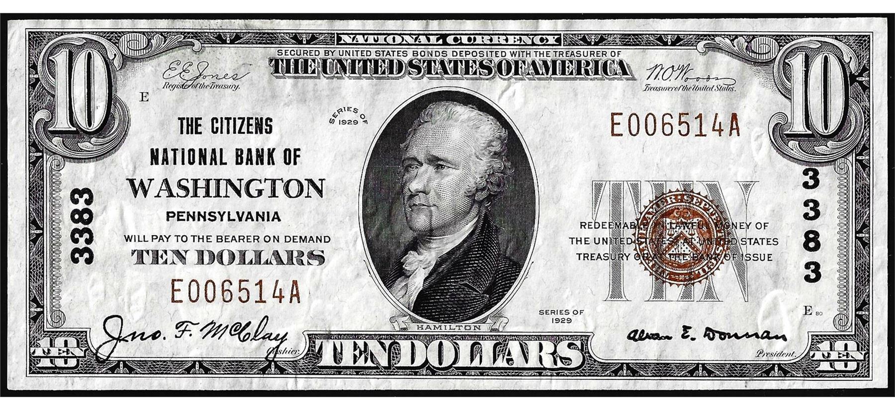One 1929 $10 Citizens NB of Washington, Pennsylvania CH# 3383 National Currency Note.