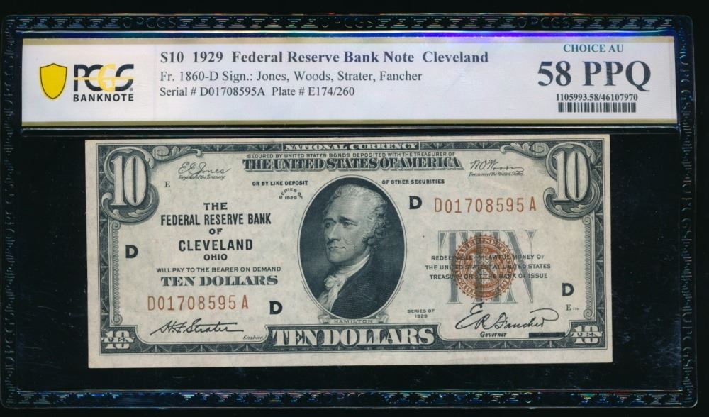 One 1929 $10 Cleveland FRBN PCGS 58PPQ.