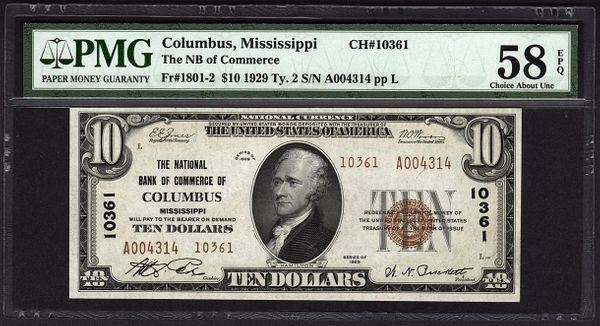 One 1929 $10 Columbus National Bank Note PMG 58EPQ.
