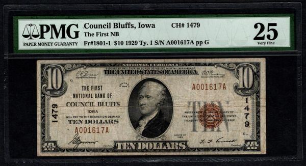 One 1929 $10 Council National Bank Note PMG 25.