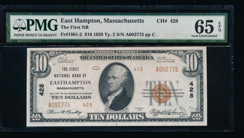 One 1929 $10 East Hampton National Bank Note PMG 65EPQ.