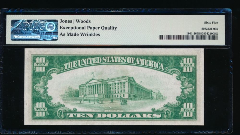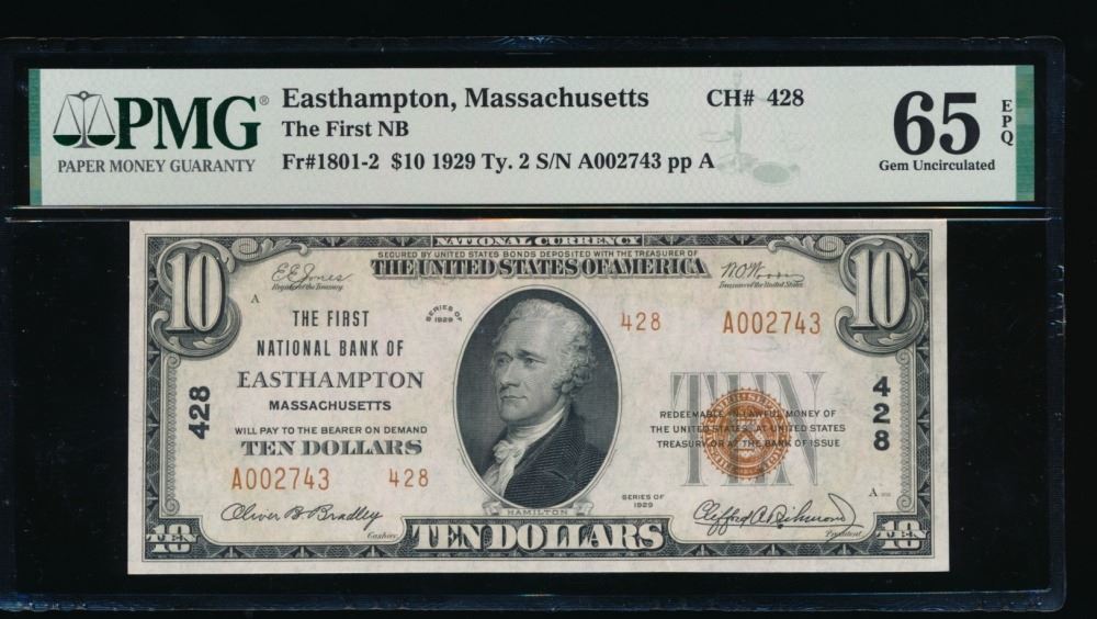One 1929 $10 Easthampton MA National PMG 65EPQ.