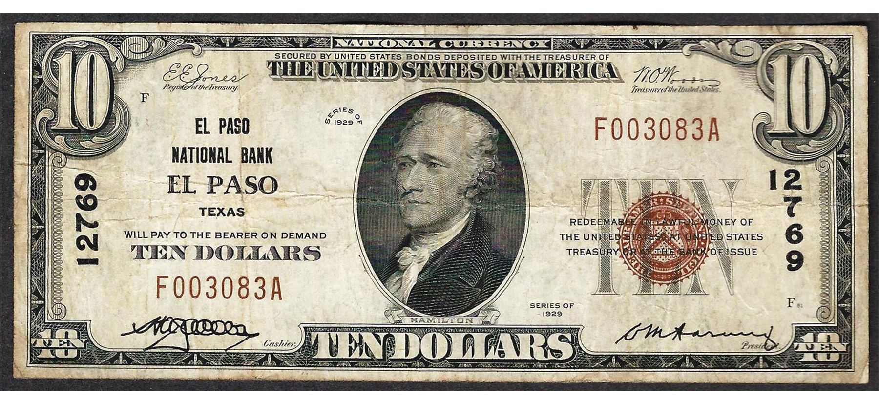 One 1929 $10 El Paso Texas National Currency Note CH# 12769.