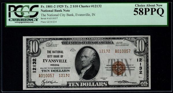 One 1929 $10 Evansville National Bank Note PCGS 58PPQ.