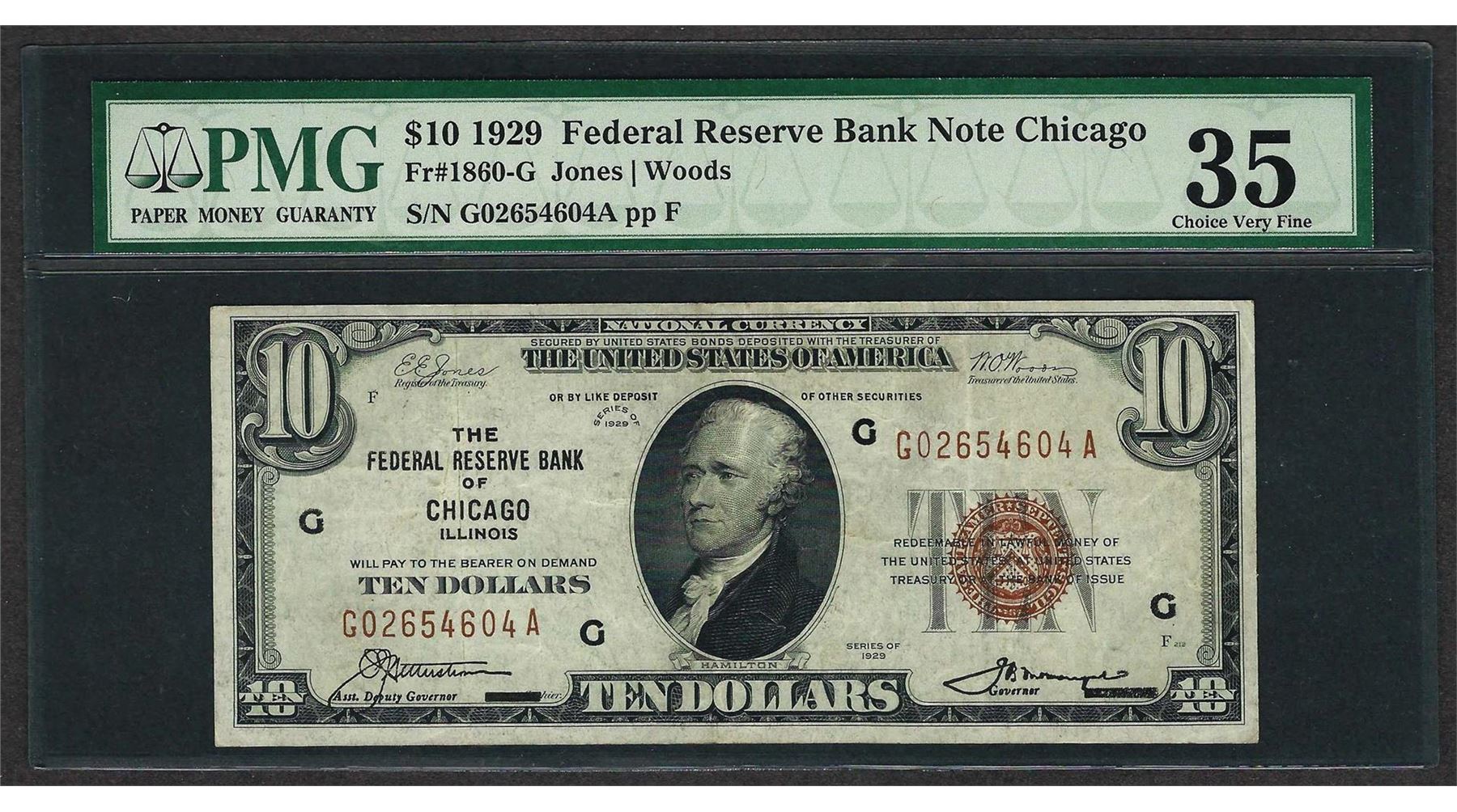 One 1929 $10 Federal Bank of Chicago Note Fr.1860-G PMG Choice Very Fine 35. PMG Certified.