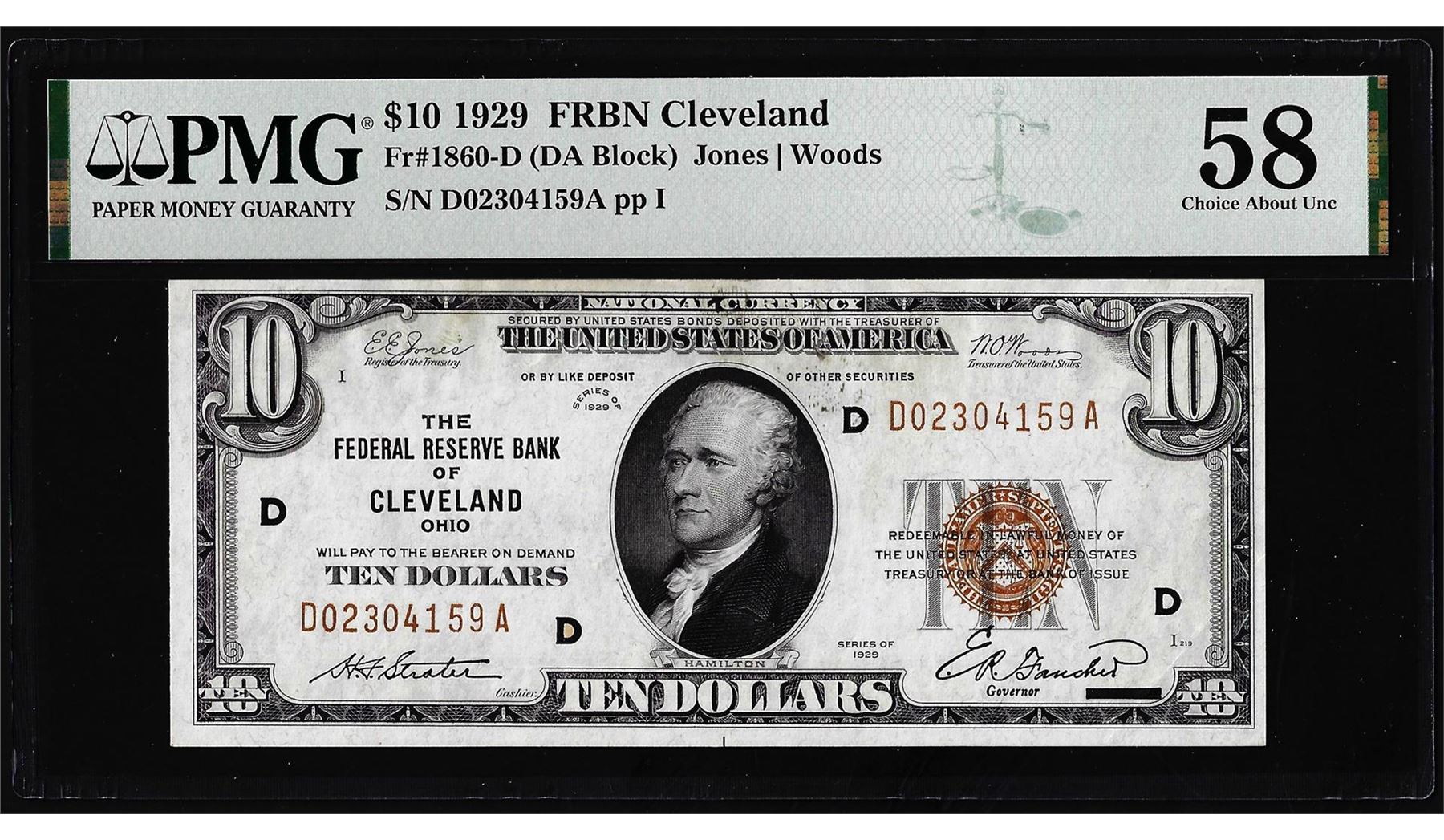 One 1929 $10 Federal Reserve Bank Note Cleveland Fr.1860-D PMG Ch. About Uncirculated 58. PMG Certified.