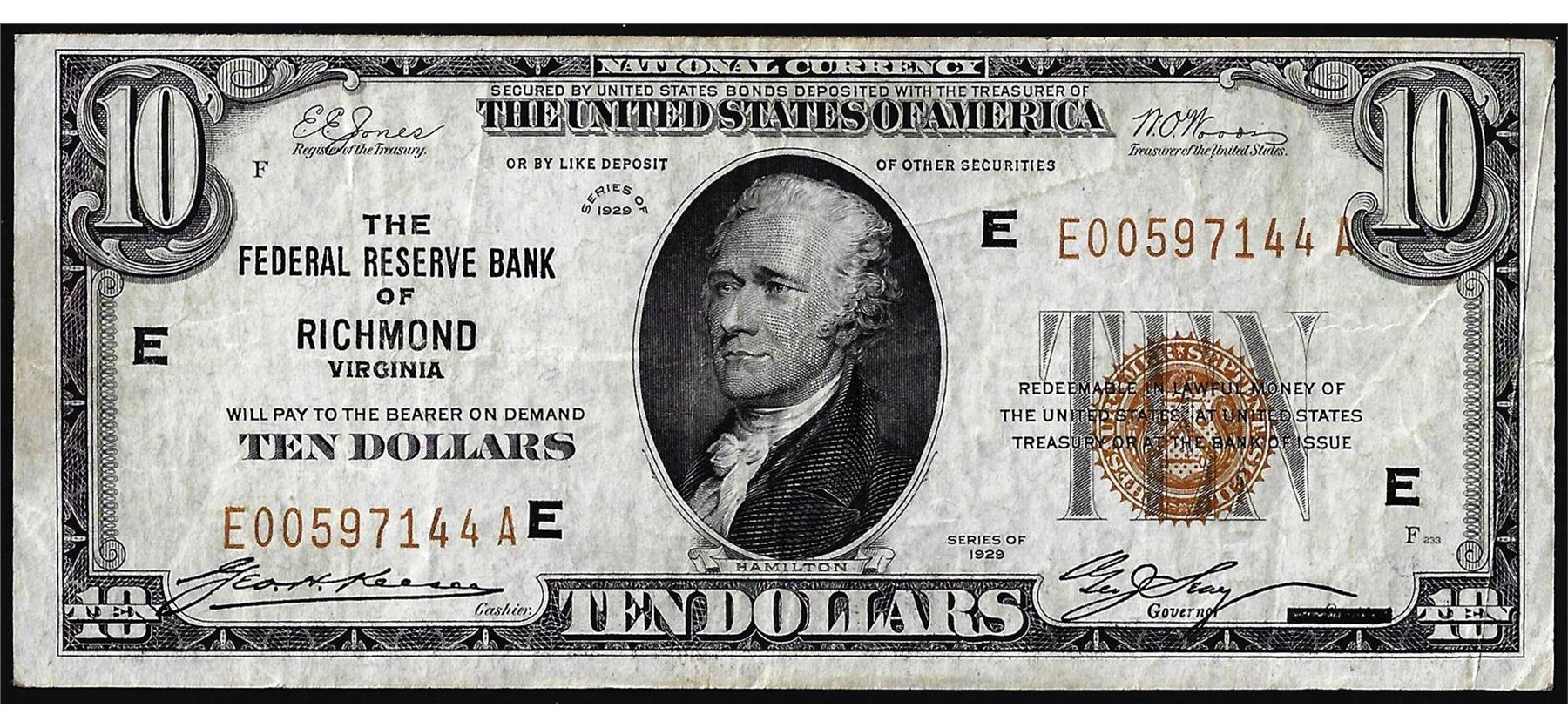 One 1929 $10 Federal Reserve Bank Note Richmond.