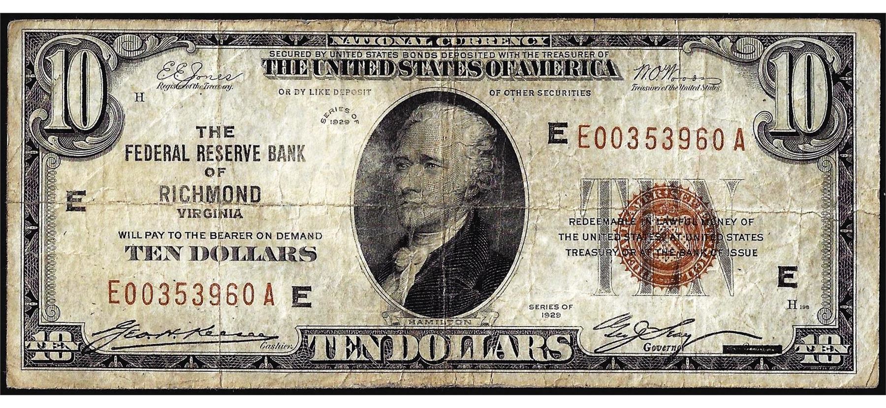 One 1929 $10 Federal Reserve Bank Note Richmond.
