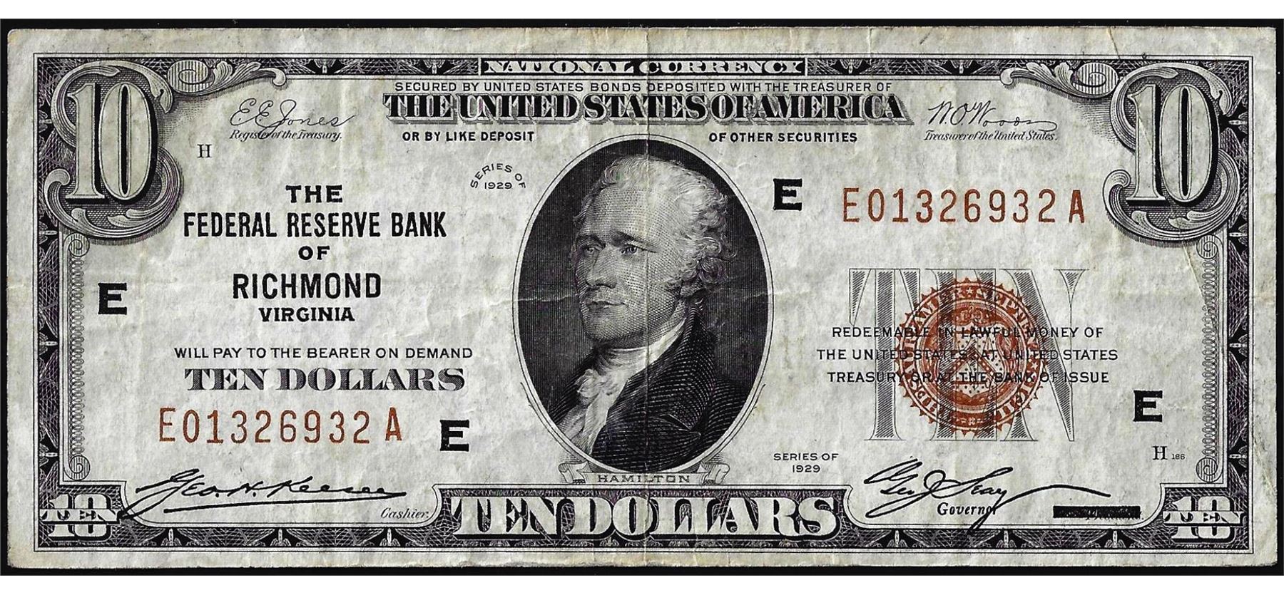 One 1929 $10 Federal Reserve Bank Note Richmond.
